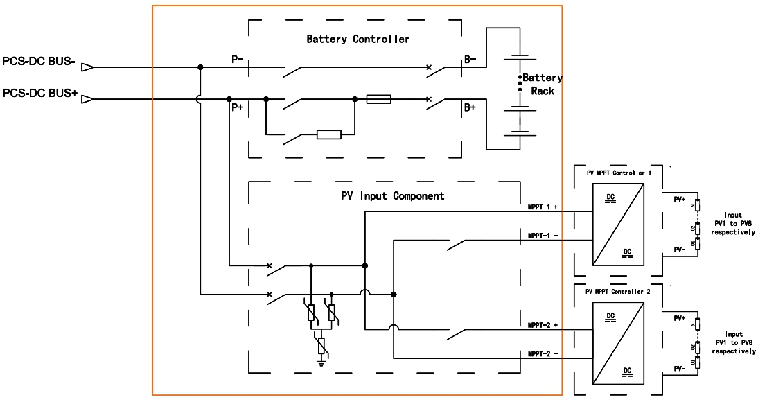 3. Valfri PV DC-kopplad åtkomst för att matcha en nav- och eker MPPT-kontroller;