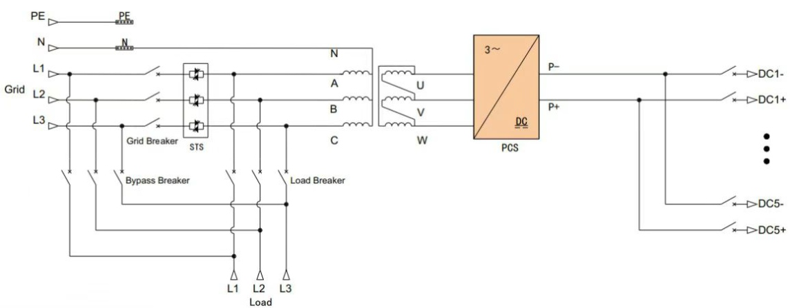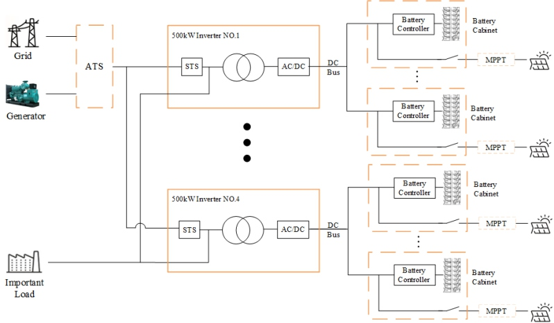 2. När man använder flera 500 kW-system parallellt och distribuerar STSa över olika 500 kW-växelriktare, är det avgörande att säkerställa att kabellängden från nätets kopplingspunkt till belastningskopplingen är konsekvent;